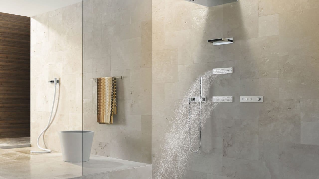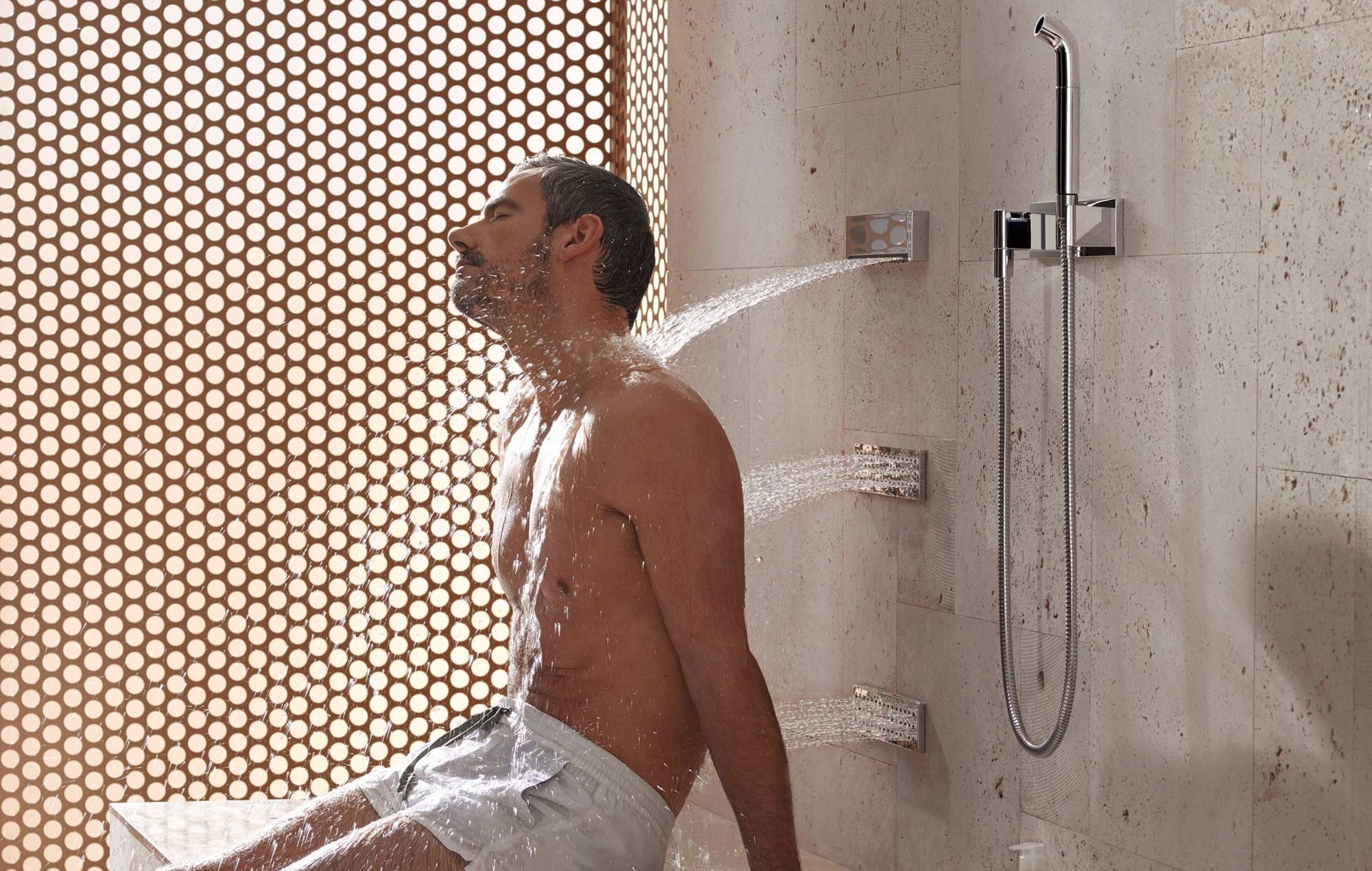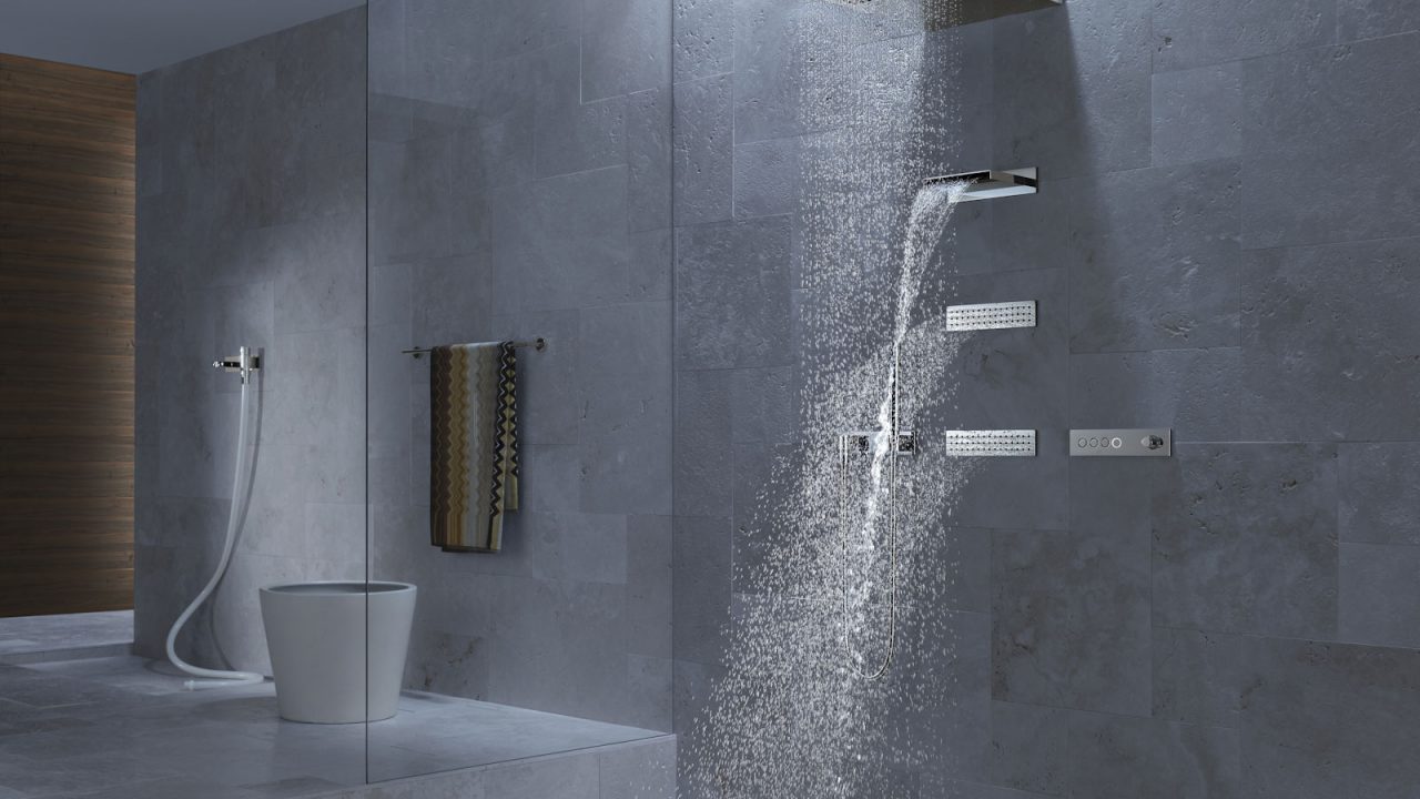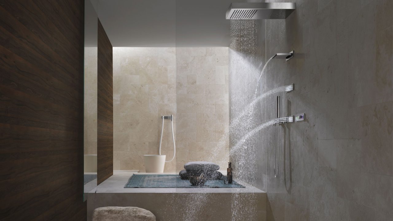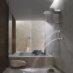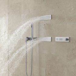 DORNBRACHT VERTICAL SHOWERATT (Вертикальный душ) – это комбинация специальных потребителей с различными видами струй. JUST RAIN обволакивает тело крупными жемчужными каплями. Мощный поток чистой прозрачной воды ниспадает на плечи из WATER SHEET. В это время спину стимулируют струи, поступающие из WATER BARS. Также как и при использовании системы HORIZONTAL SHOWERATT, посредством пнели eTOOL можно выбирать желаемую хореографию из трех представленных: BALANCING, ENERGIZING и DE-STRESSING.