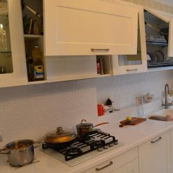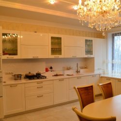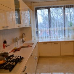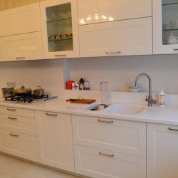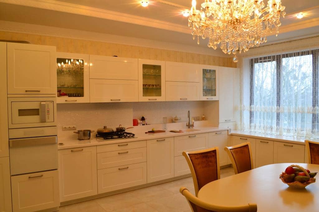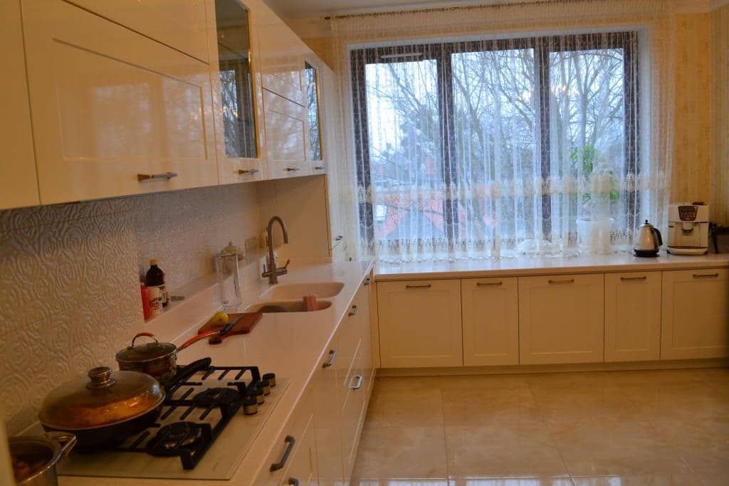 - Тумбы под окном ниже тумб основной кухни. Перепад высот столешницы сведен с помощью столешницы из искусственного камня.