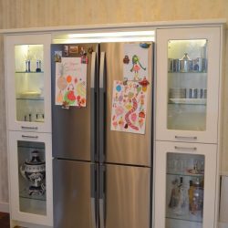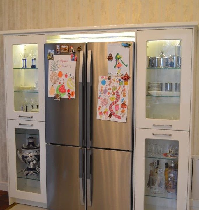- Оставшееся после перепланировки помещения углубление в стене использовали как нишу для холодильника, обрамив все витринами кухонного гарнитура.