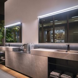 Универсальность коллекции мебели для ванной Dogma была продемонстрирована на Cersaie в трех совершенно разных композициях: цветовая палитра во всех трех случаях в оттенках серого показывает, насколько Idea Group заботится о концепции ванной комнаты в целом.