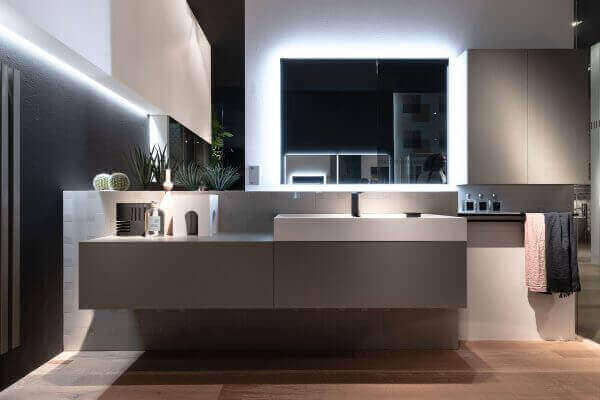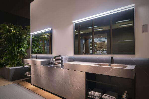 Цвет – в тонких прожилках мрамора или в алюминиевом профиле, который обрамляет и поддерживает мебель для ванной.