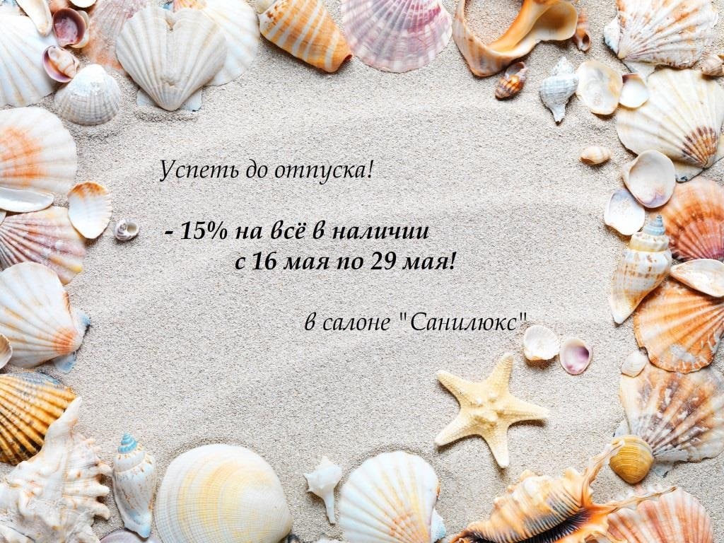 - Успеть до отпуска! Специальная скидка -15% на всю продукцию в наличии в салоне Sanilux. Акция продлится до 29 мая.